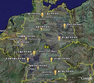 CCTV 世界杯节目中每天飞翔到的全套 2006 世界杯场馆的地标,这应该是第一套中文的 Google Earth 世界杯地标了(因为搜索没有搜到 :-) ),很珍贵哦!