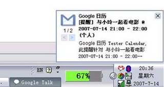 的“新邮件显示通知”功能。这样一来,我在无需打开 Gmail 和谷歌日历情况下,通过计算机托盘中 Google Talk 图标上方看见以“