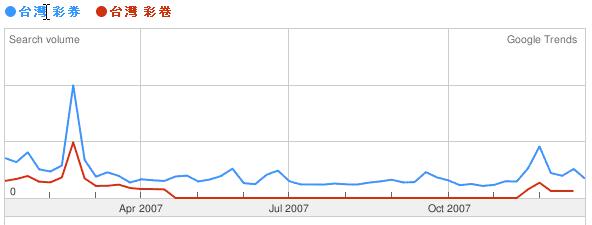 台湾榜单还公布了 Google 搜索关键字中最常出现的错字,居然是 大家总是把“台湾彩‘券’”写成了“台湾彩‘卷’”