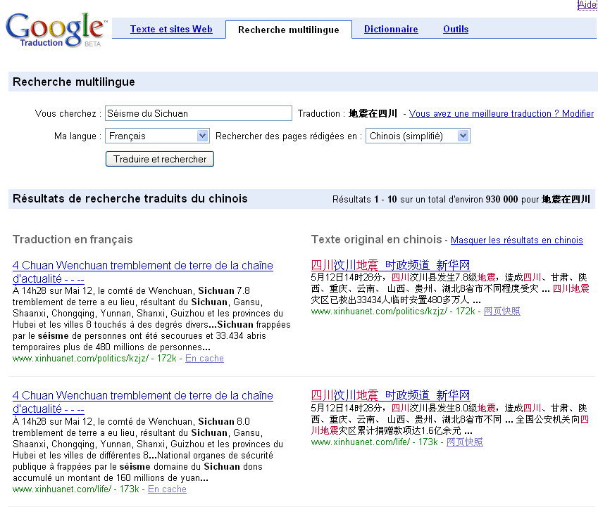 例如,法国的网民想要了解中文网页中提到有关四川地震的资讯,可以到谷歌翻译的法国网站 http://translate.google.fr 使用“翻译搜索”。首先,选定“Recherche multilingue”(“翻译搜索”或“多语种搜索”的法语),接着输入“Séisme du Sichuan”(“四川地震”的法语),对选搜索语言“chinois( simplifie )”(“简体中文”的法语)进行搜索,谷歌翻译会把输入的法语 “Séisme du Sichuan“自动译成中文“四川地震”,并如图一在右侧列出简体中文的搜索结果,再把这些简体中文的搜索结果自动译成法文,如果使用者选择左侧法文译文的链接,谷歌翻译会把该文进行网页翻译(从简体中文译成法文)显示(如图二)。我们希望这样的功能,能帮助关心四川灾情的外国友人更了解目前救灾抗震所遇到的困难。