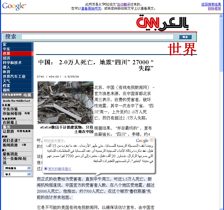 想了解全球其他语言的网页如何报道中国四川地震灾情,可以在“谷歌翻译”的“经过翻译的搜索结果”http://translate.google.cn/translate_s,输入“四川地震”,把“我的语言”设成“中文(简体)”,并选择“待搜索网页的语言”,例如,选择“阿拉伯文”,会得出类似图三的结果(实际结果因搜索时阿拉伯文网页变动而异),点击左侧中文译文的链接,谷歌翻译会对该文进行网页翻译(从阿拉伯文译成简体中文)显示(如图四)。你也可以试试对其他的二十余种语言进行翻译搜索,只要在改变“待搜索网页的语言”后按下“翻译并搜索”即可。