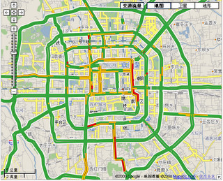 点击谷歌地图上的按钮“交通流量”,最新时刻的北京地区交通流量图就呈现在你面前。绿色标志着此路畅通,红色表示拥堵,黄色表示车行缓慢。一眼望去,清晰而且直观。