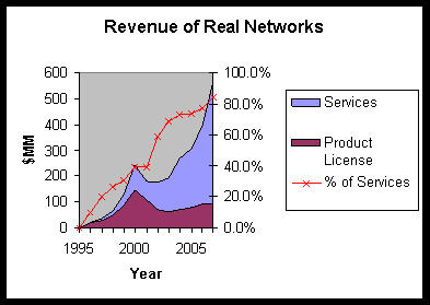 Real Networks 源于微软又被微软打败。虽然它的境遇和网景公司有些相似,但是,两家公司失败的原因不尽相同。网景公司是被动地死守浏览器市场,但是在微软捆绑的打击下节节败退,最后无险可守,从此从人们的视线中消失了。Real Networks 也许因为是微软自己人办的公司,谙熟微软的竞争之道,所以一开始就不断在找退路,它在做播放器的同时,提供了多项基于互联网的广播和电视服务。Real Networks 通过向互联网用户收费订阅费(Subscription Fee)挣钱,同时在广播和电视中插播一些广告。除此之外,它还有音乐付费收听和视频付费收看等等。比如在网上听歌每月十三美元,网上玩游戏每月十美元。由于 Real Networks 比较早进入服务市场,同时服务市场又一直是微软的弱项,它在失去了播放器软件市场后,终于守住了网络音频和视频服务的市场。服务性收入在 Real Networks 的营业额中份额,最初是空白,但是逐年增加,去年 2007 年达到了 83%。(见下图)