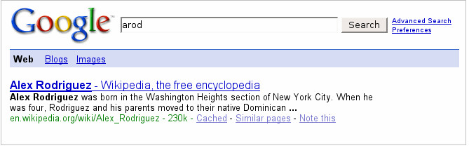 过去一段时间,我们一直在用确定网页相关部分的算法改进网页摘录。搜索的变化包括细微的变化——我们在搜索结果中标志您所查询关键词的同义词——以及更为显著的变化。下面的一个范例截图中,当用户搜索“arod”一词时,您可以看到,搜索结果摘录中的“Alex”和“Rodriguez”都以粗黑体显示,因为基于我们的分析,您的查询词可能会是指他的名字: