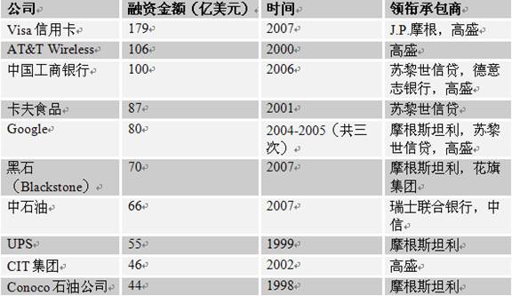 高盛公司是世界最大的上市承包商,承包了世界上有史以来最大的上市行动中的一半,见下表