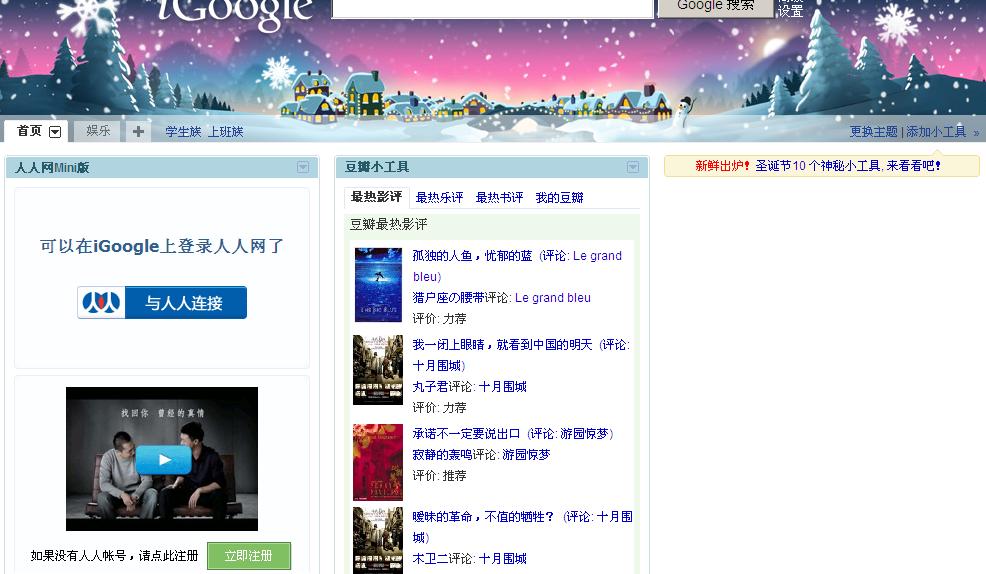 人人网Mini版和豆瓣小工具,让你的iGoogle主页与热门SNS亲密接触,从此不用切换页面即可登陆人人网,时时关注好友留言,或者查看豆瓣的最热影评等。