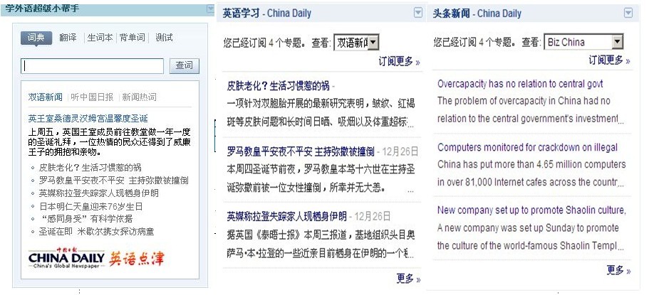 想学英语?用不着再满世界找英语资料,让China Daily英语学习和头条新闻,成为你学英语的左膀右臂!右侧的下拉菜单可以让你在双语新闻、新闻听力、英语金曲或者英语热词之间轻松切换。此外,学外语超级小帮手也可助你事半功倍。